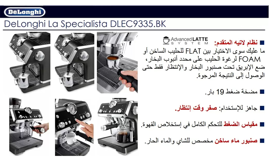 نظام الاتيه المتقدم: ما عليك سوى الاختيار بين FLAT للحليب الساخن أو FOAM لرغوة الحليب على محدد أنبوب البخار، ضع الابريق تحت صنبور البخار وانتظر فقط للوصول إلى النتيجة المرجوة.